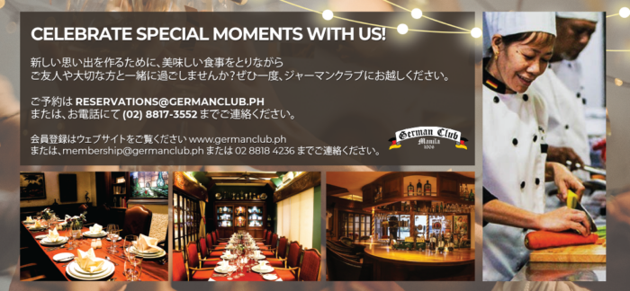 115年もの歴史をもち、フィリピンでも有数の伝統を誇るジャーマンクラブ。長きにわたり、フィリピンのビジネスパーソンや政治家、駐在員の方々がご利用されて来ました。会員は、クラブの提供する雰囲気と素晴らしい料理、そして幅広いコミュニケーションをお楽しみいただけるほか、バー、個室、セミナールームの優待利用も可能。さらにメンバー限定のフォーラムやイベントへの参加、提携施設での優待を受けることができます。ぜひフィリピンの新たな交流の場として御利用になってみませんか?