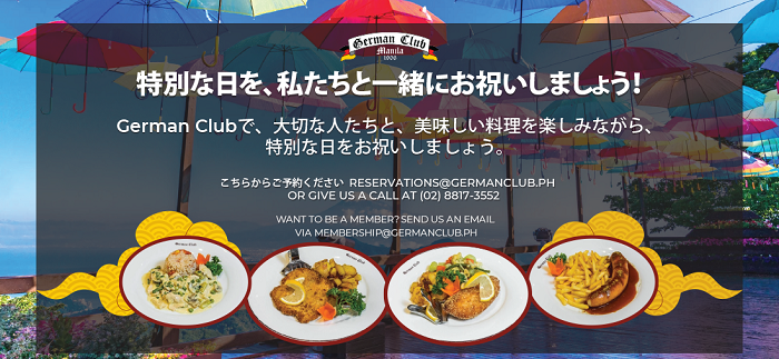 115年もの歴史をもち、フィリピンでも有数の伝統を誇るジャーマンクラブ。長きにわたり、フィリピンのビジネスパーソンや政治家、駐在員の方々がご利用されて来ました。会員は、クラブの提供する雰囲気と素晴らしい料理、そして幅広いコミュニケーションをお楽しみいただけるほか、バー、個室、セミナールームの優待利用も可能。さらにメンバー限定のフォーラムやイベントへの参加、提携施設での優待を受けることができます。ぜひフィリピンの新たな交流の場として御利用になってみませんか?