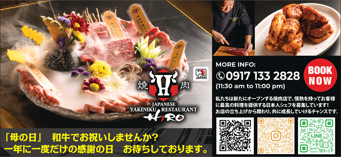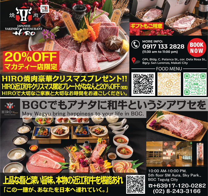 マカティーが誇る最大のショッピングモールであるグリーンベルトから徒歩3分にある『HIROJAPANESE YAKINIKU RESTAURANT』、日本の3大和牛の一つ近江和牛中心のメニュー構成になっています。『日本の味をそのままに!』をコンセプトに日本人井澤シェフが和牛のおいしさを最大限に引き出し、口に入れた瞬間にとろけるような食感と和牛特有の甘さが口の中に広がります。この近江牛は、日本滋賀県の近江和牛農家から正規ルートで直輸入、新鮮で本物の和牛を堪能頂けます。マニラで本格焼肉をぜひご堪能くださいませ。