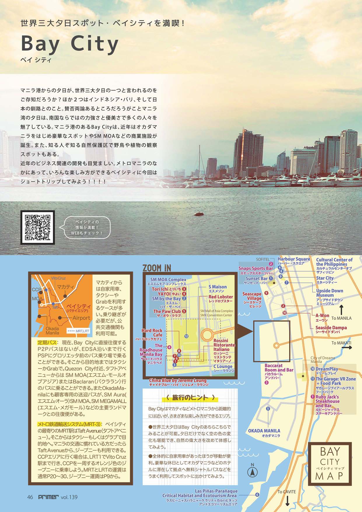 - マニラ湾からの夕日が、世界三大夕日の一つと言われているのをご存じだろうか?ほかの2つはインドネシア・バリ、そして日本の釧路とのこと。賛否両論あるところだろうがことマニラ湾の夕日は、南国ならではの力強さと優美さで多くの人々を魅了している。マニラ湾のあるBay Cityは、近年はオカダマニラをはじめ豪華なスポットやSM MOAなどの商業施設が誕生。また、知る人ぞ知る自然保護区で野鳥や植物の観察スポットもある。 近年のビジネス関連の開発も目覚ましい。メトロマニラのなかにあって、いろんな楽しみ方ができるベイシティに今回はショートトリップしてみよう!!!!