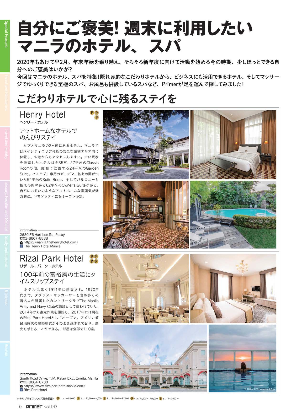 - 2020年もあけて早2月。年末年始を乗り越え、そろそろ新年度に向けて活動を始める今の時期。少しほっとできる自分へのご褒美はいかが? 今回はマニラのホテル、スパを特集!隠れ家的なこだわりホテルから、ビジネスにも活用できるホテル、そしてマッサージでゆっくりできる至極のスパ、お風呂も併設しているスパなど、Primer が足を運んで探してみました!