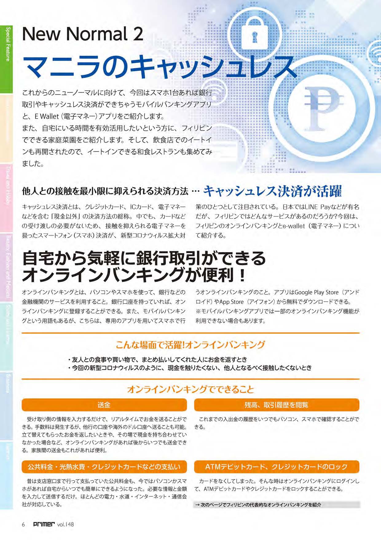 これからのニューノーマルに向けて、今回はスマホ1台あれば銀行取引やキャッシュレス決済ができちゃうモバイルバンキングアプリと、E Wallet(電子マネー)アプリをご紹介します。 また、自宅にいる時間を有効活用したいという方に、フィリピンでできる家庭菜園をご紹介します。そして、飲食店でのイートインも再開されたので、イートインできる和食レストランも集めてみました。