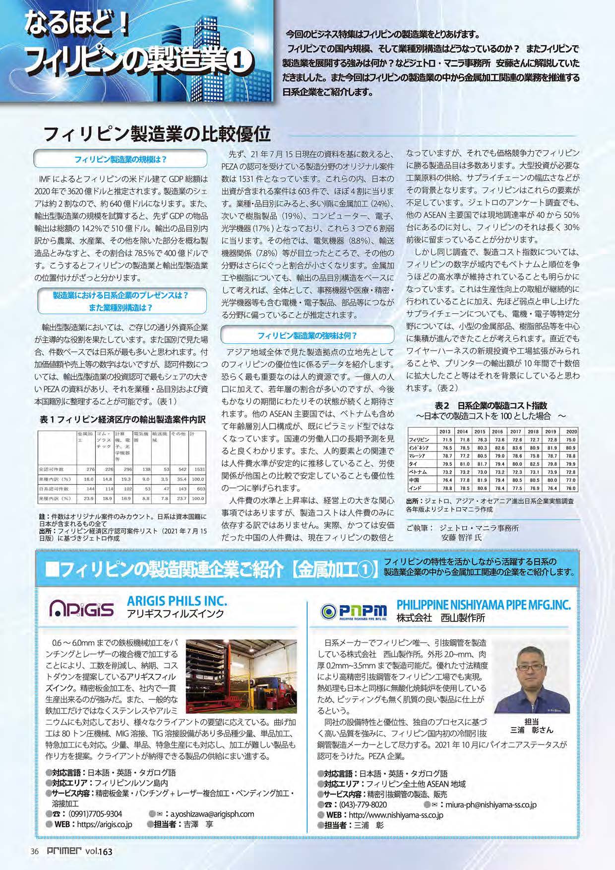 - 今回のビジネス特集はフィリピンの製造業をとりあげます。フィリピンでの国内規模、そして業種別構造はどうなっているのか?またフィリピンで製造業を展開する強みは何か?などジェトロ・マニラ事務所 安藤さんに解説していただきました。また今回はフィリピンの製造業の中から金属加工の業務を推進する日系企業をご紹介します。