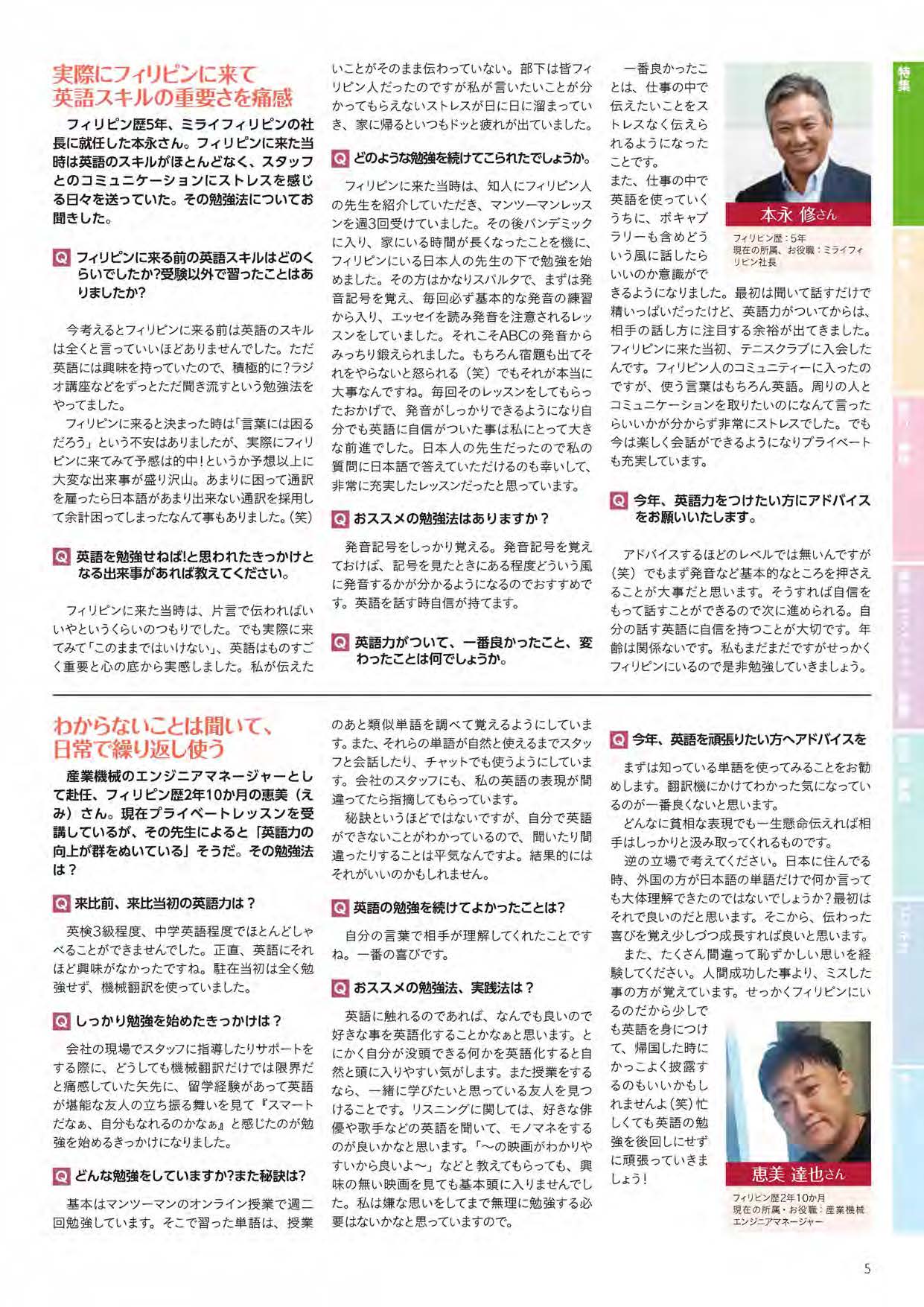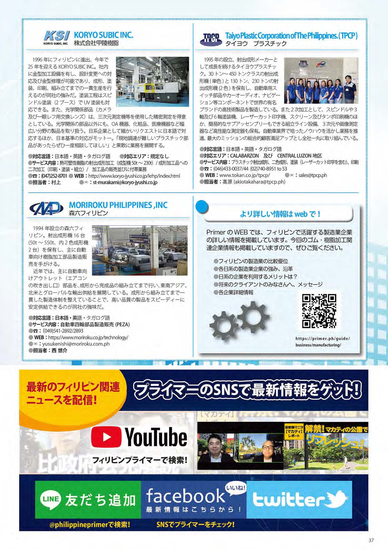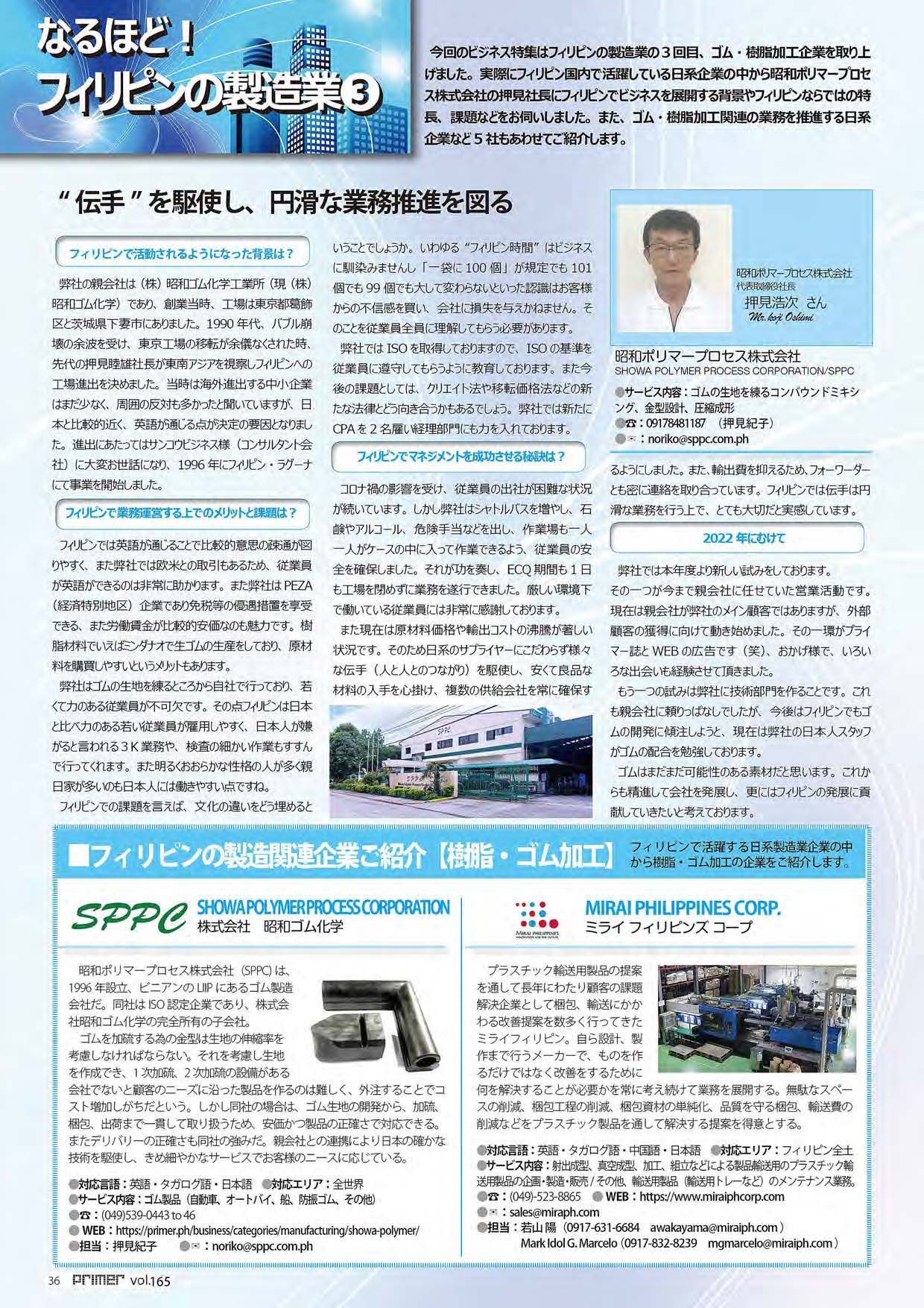 - 今回のビジネス特集はフィリピンの製造業の3回目、ゴム・樹脂加工企業を取り上げました。実際にフィリピン国内で活躍している日系企業の中から昭和ポリマープロセス株式会社の押見社長にフィリピンでビジネス展開する背景やフィリピンならではの特長、課題などをお伺いしました。また、ゴム・樹脂加工関連の業務を推進する日系企業など5社もあわせてご紹介します。