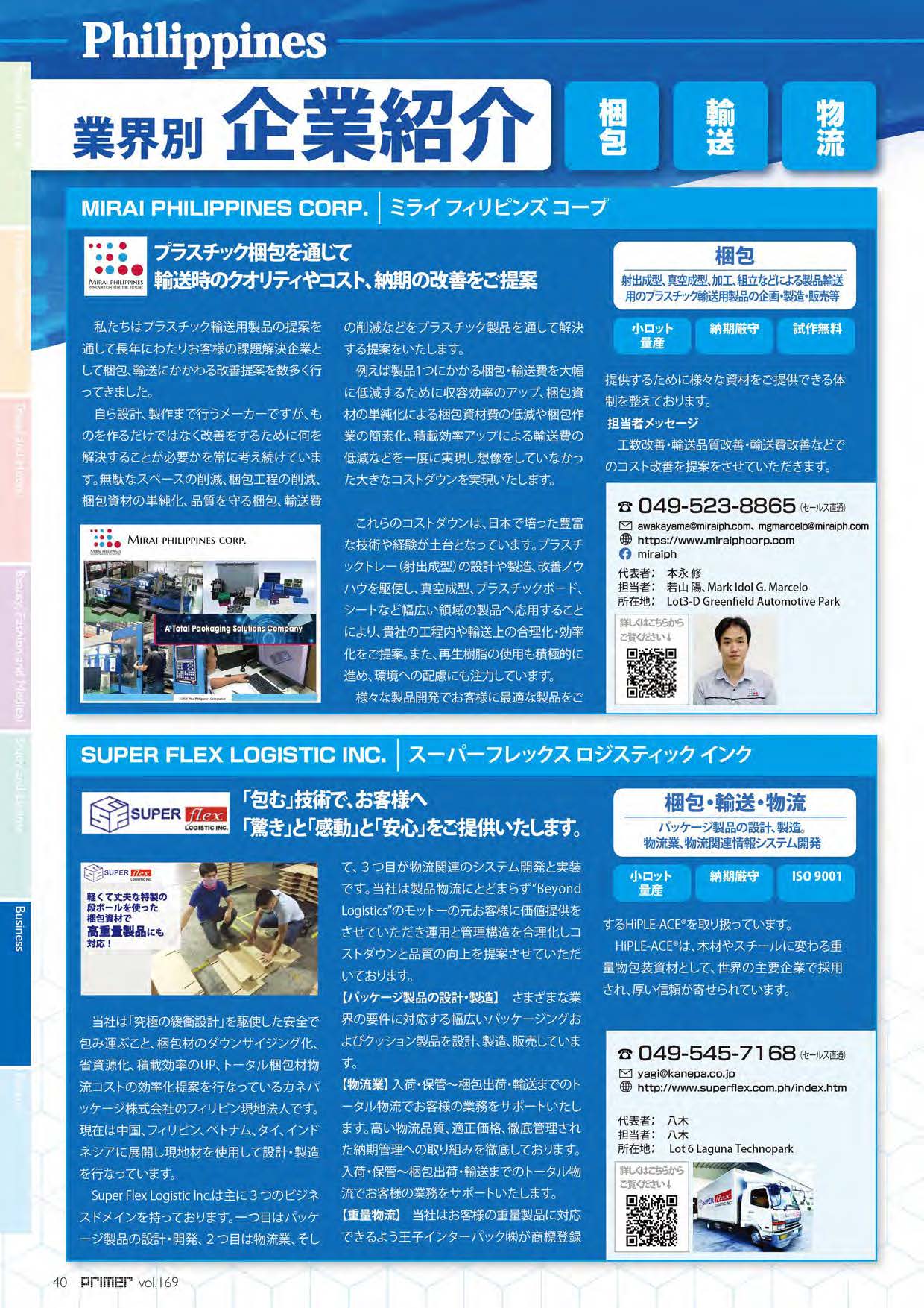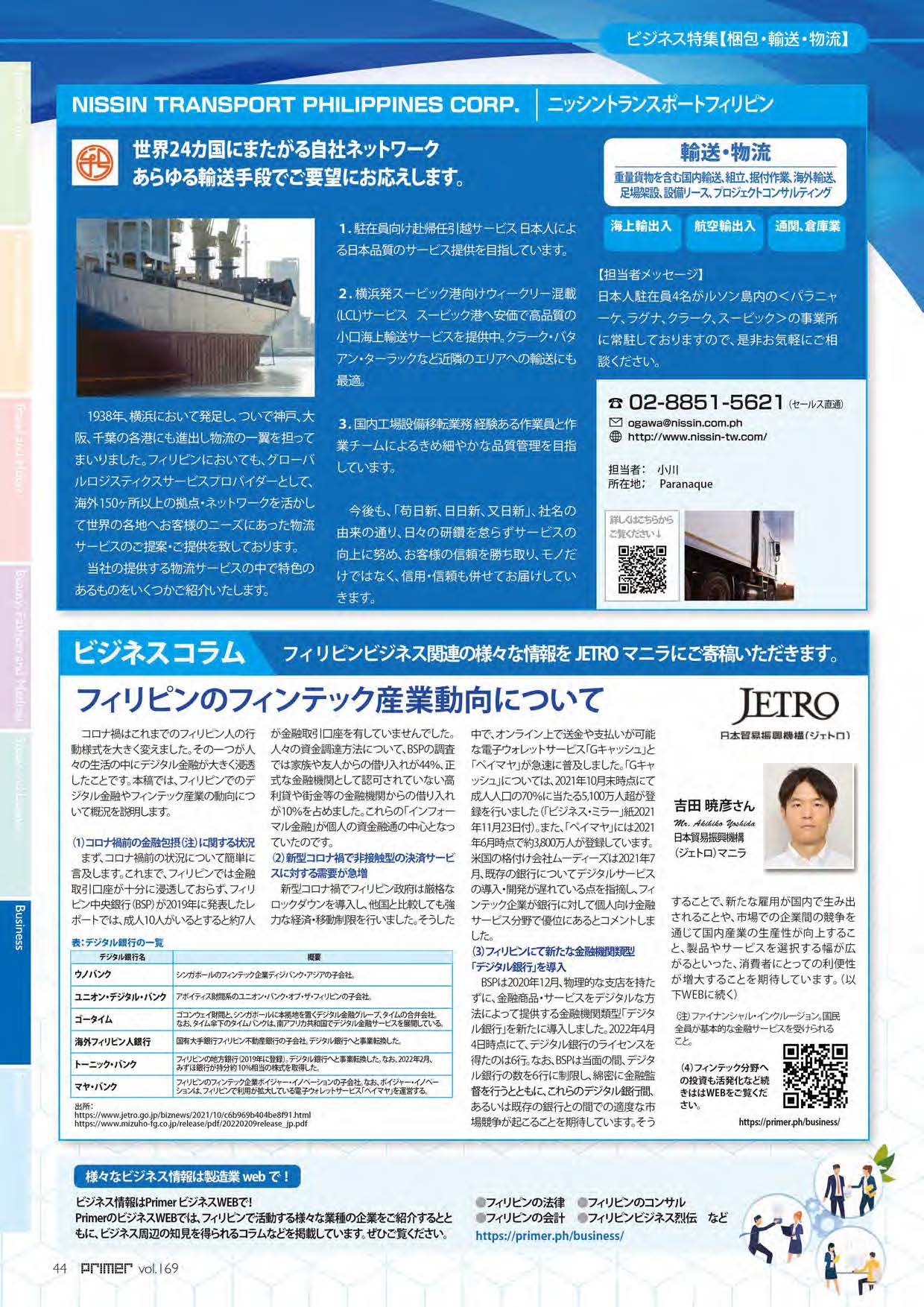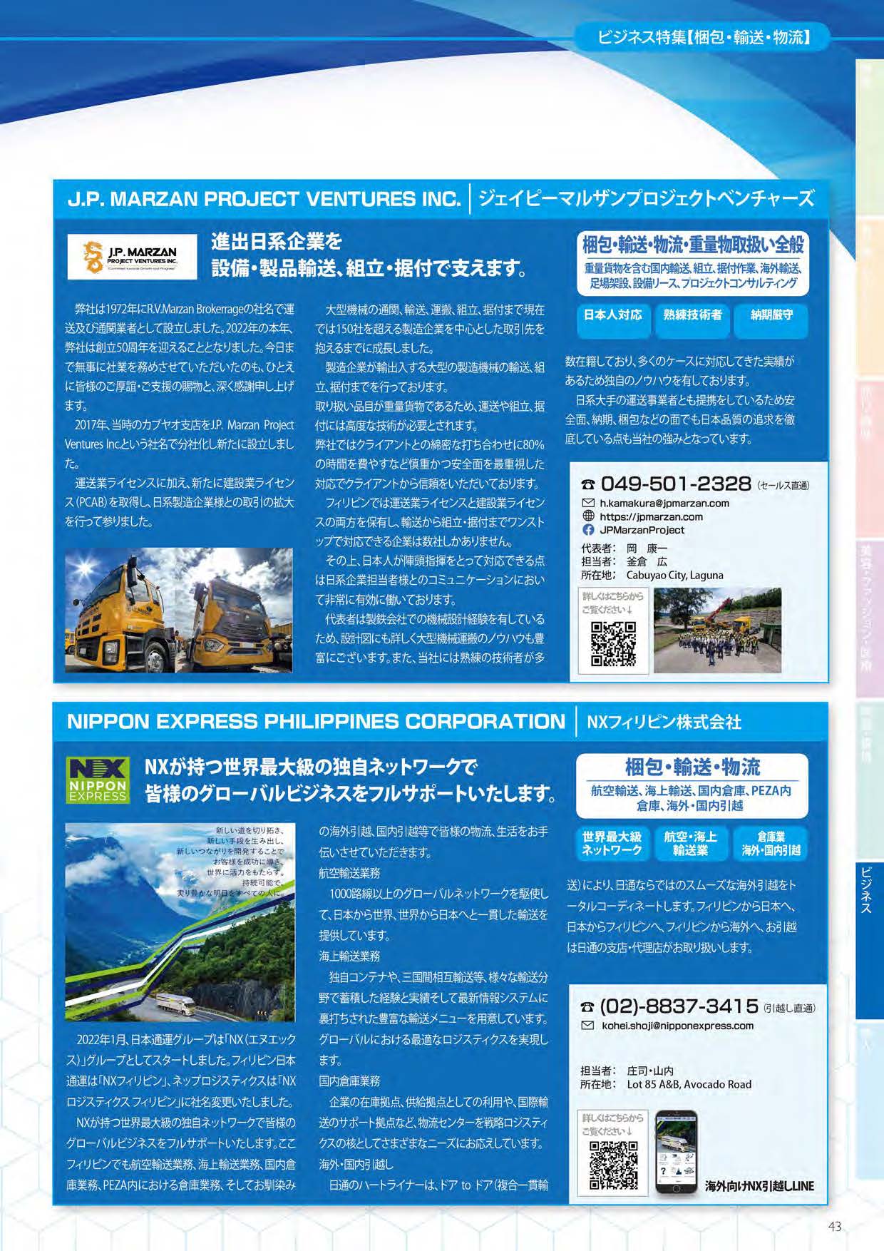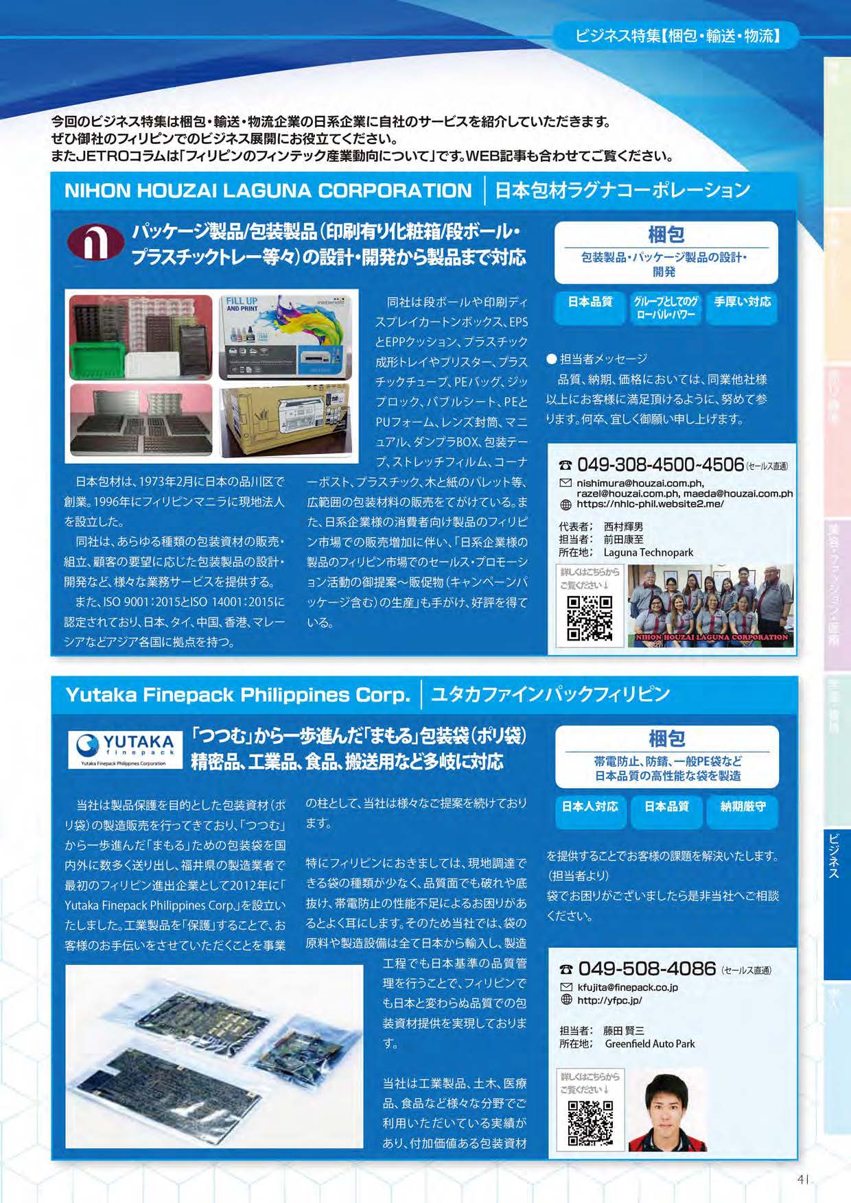 - 今回のビジネス特集は梱包・輸送・物流企業の日系企業に自社のサービスを紹介していただきます。ぜひ御社のフィリピンでのビジネス展開にお役立てください。またJETROコラムは「フィリピンのフィンテック産業動向について」です。