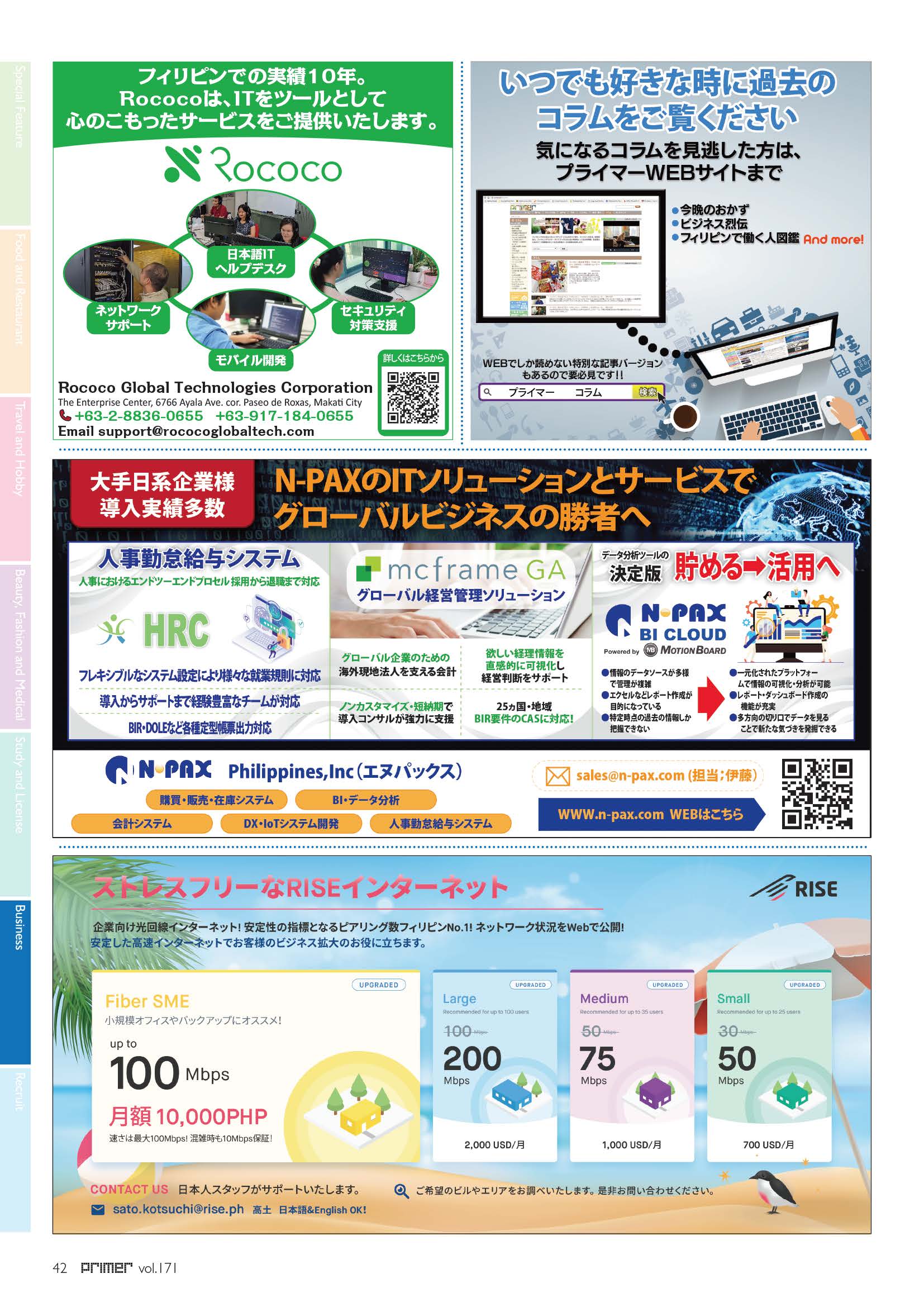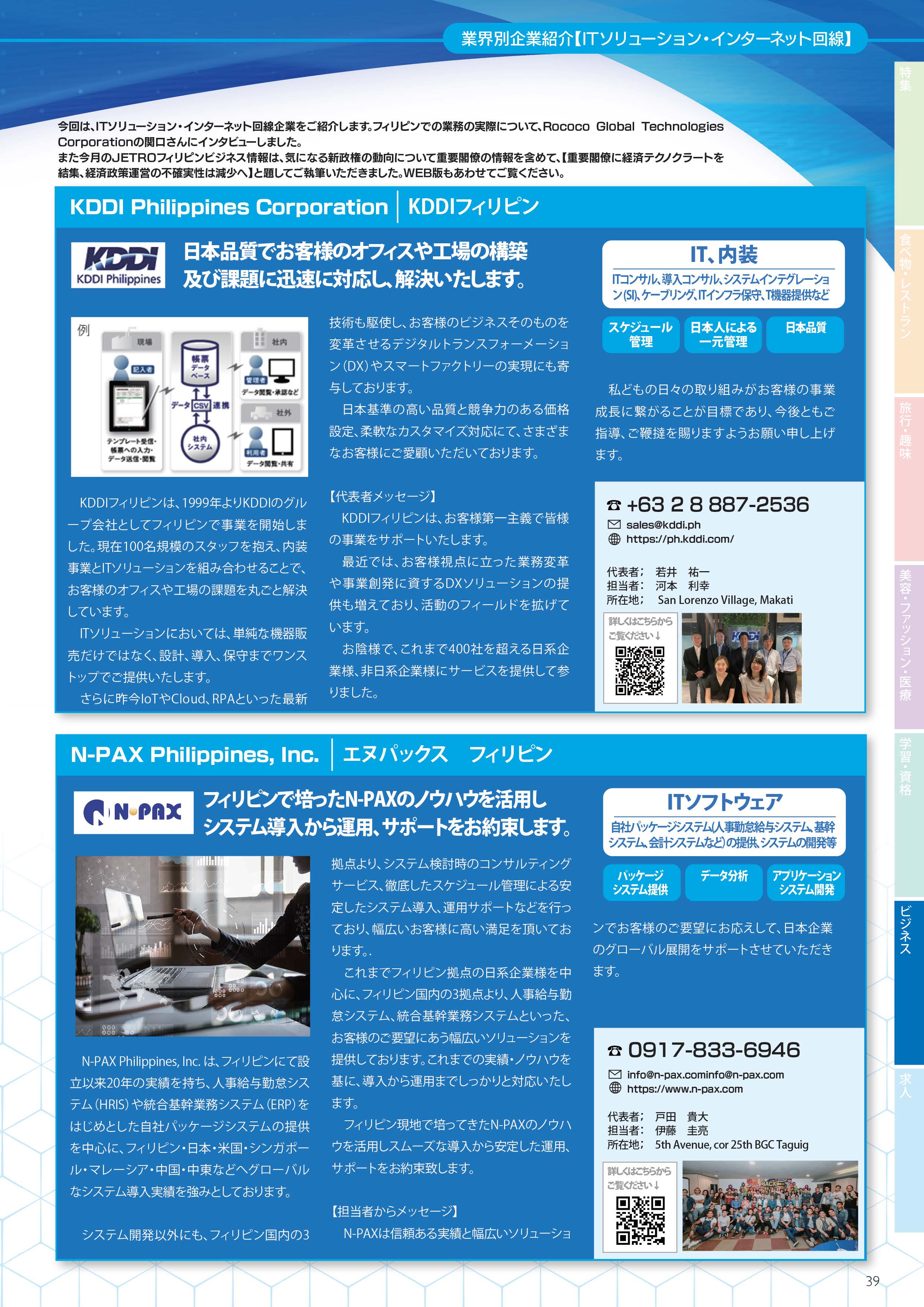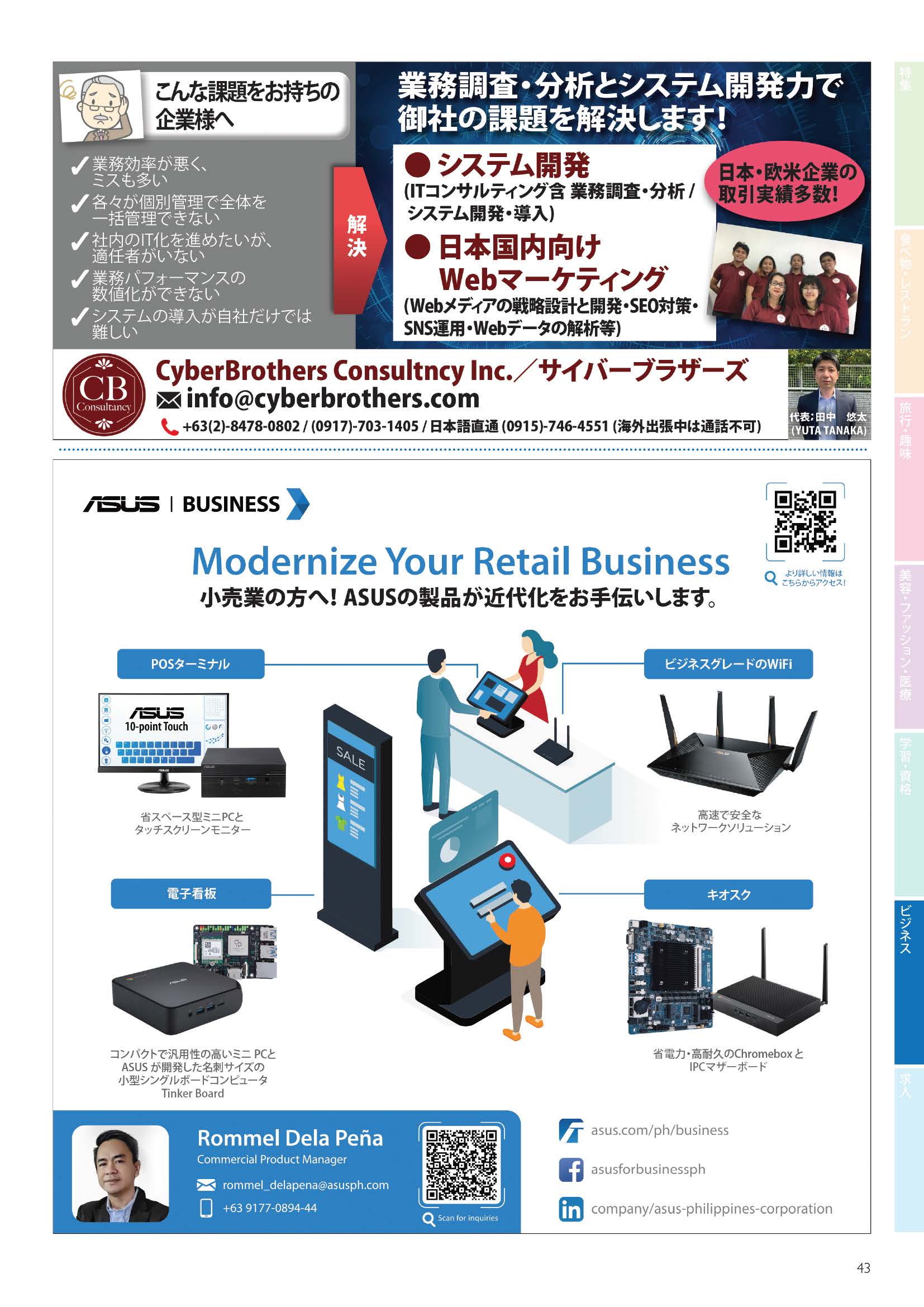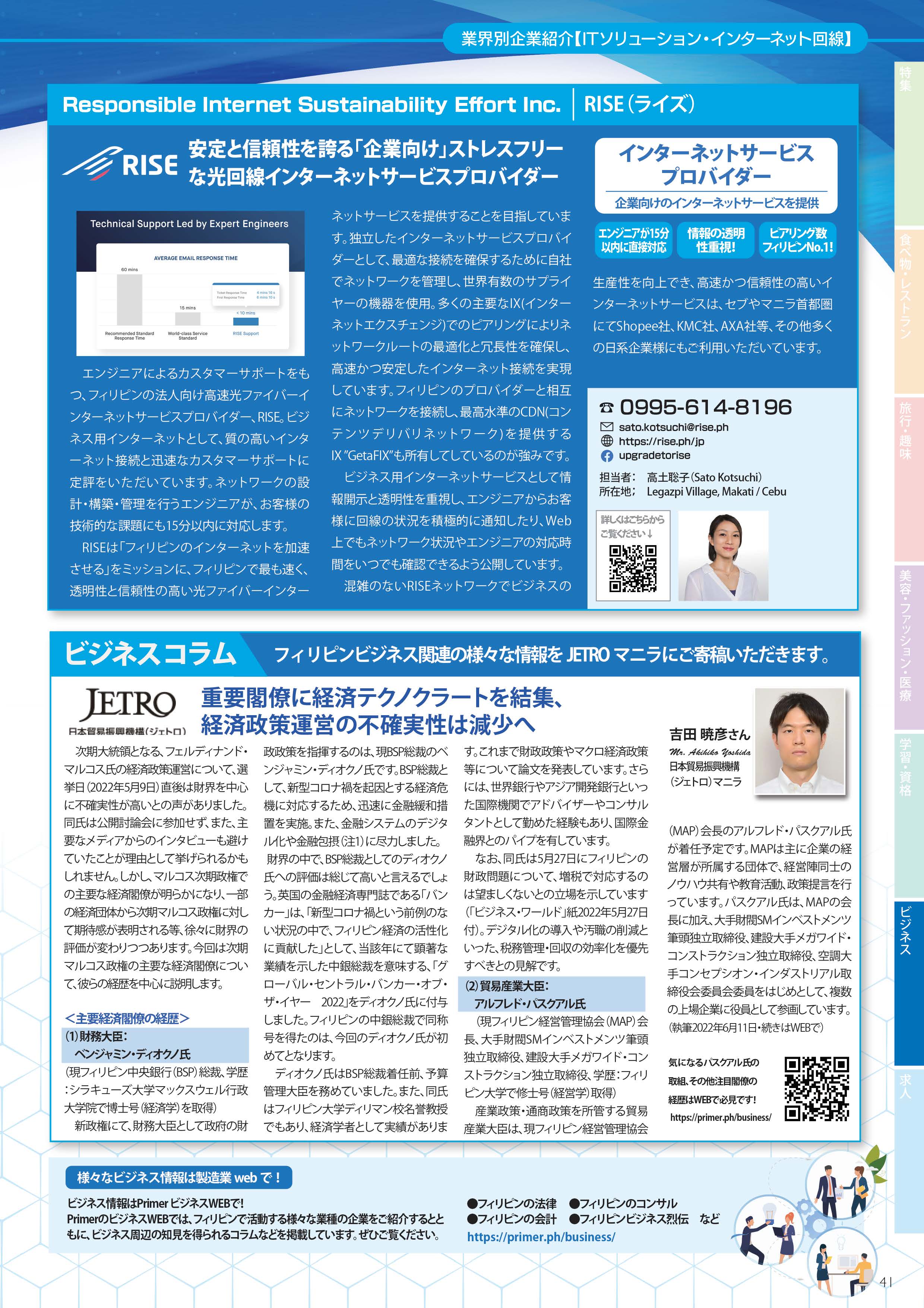 - ビジネス特集は、装いもあらたに【業界別企業紹介】として再スタート!本号ではITソリューション・インターネット回線とその周辺業界の注目情報を集めました。 またJETROのフィリピンビジネスコラムも必見です!