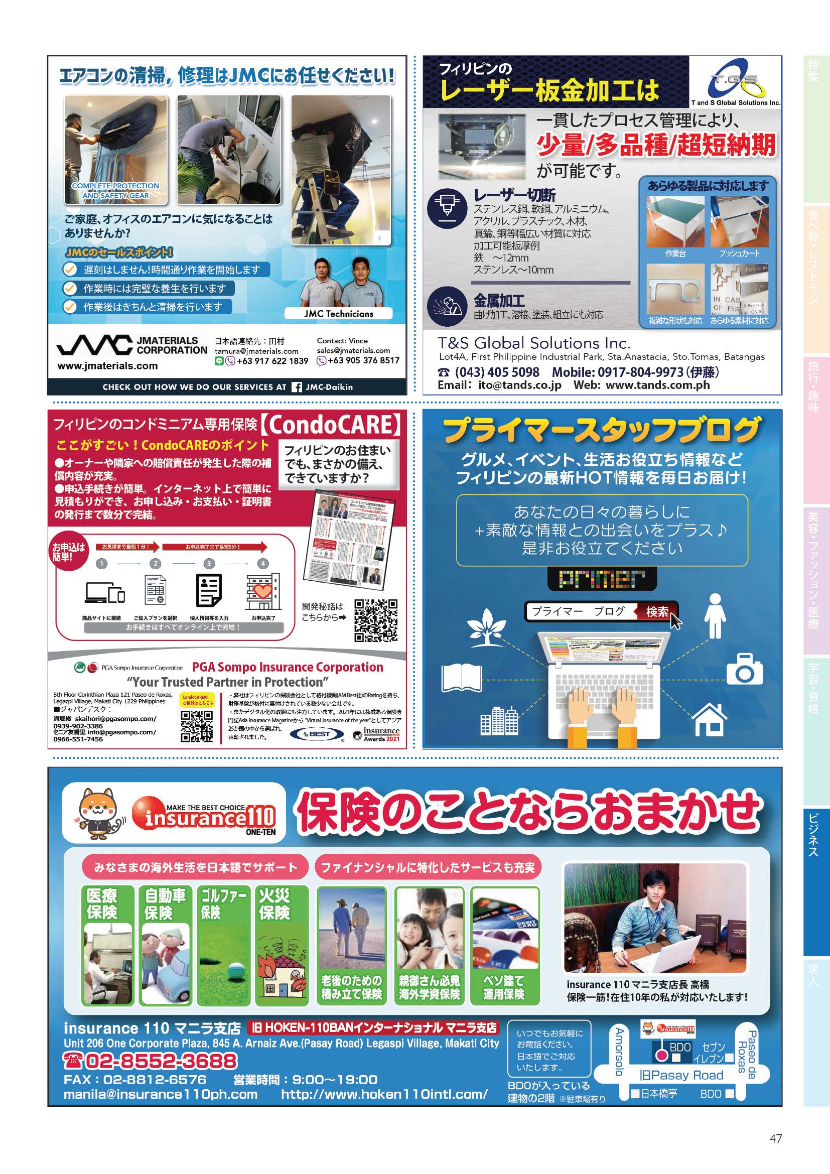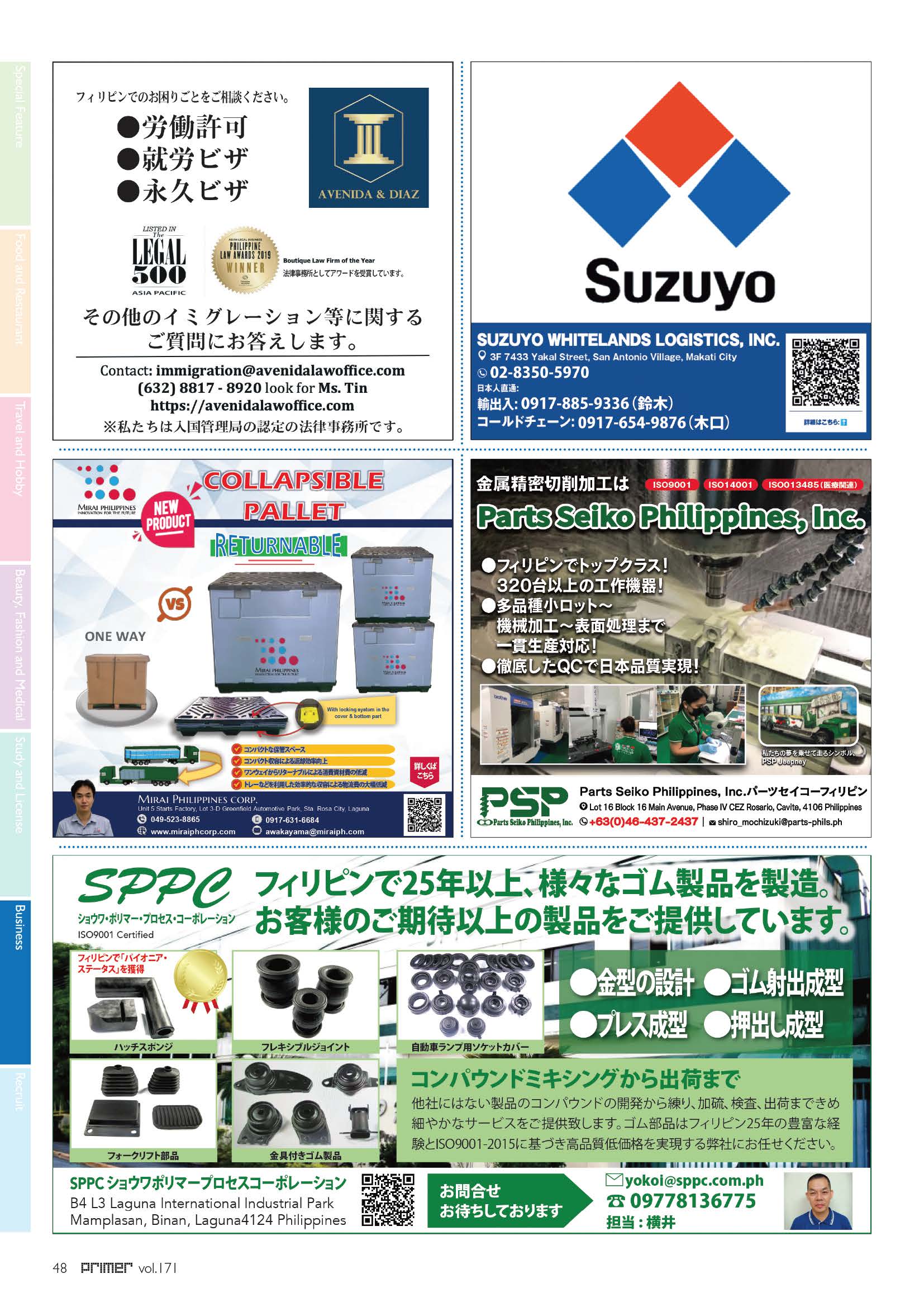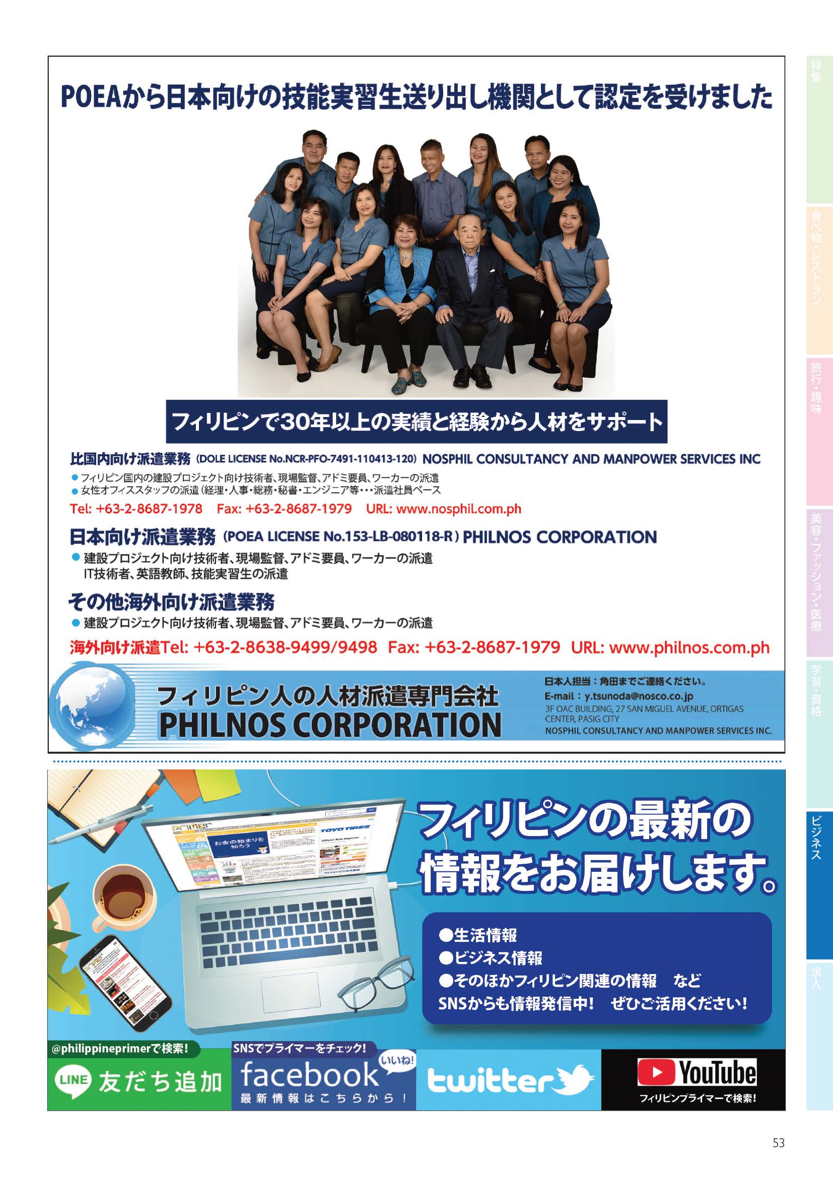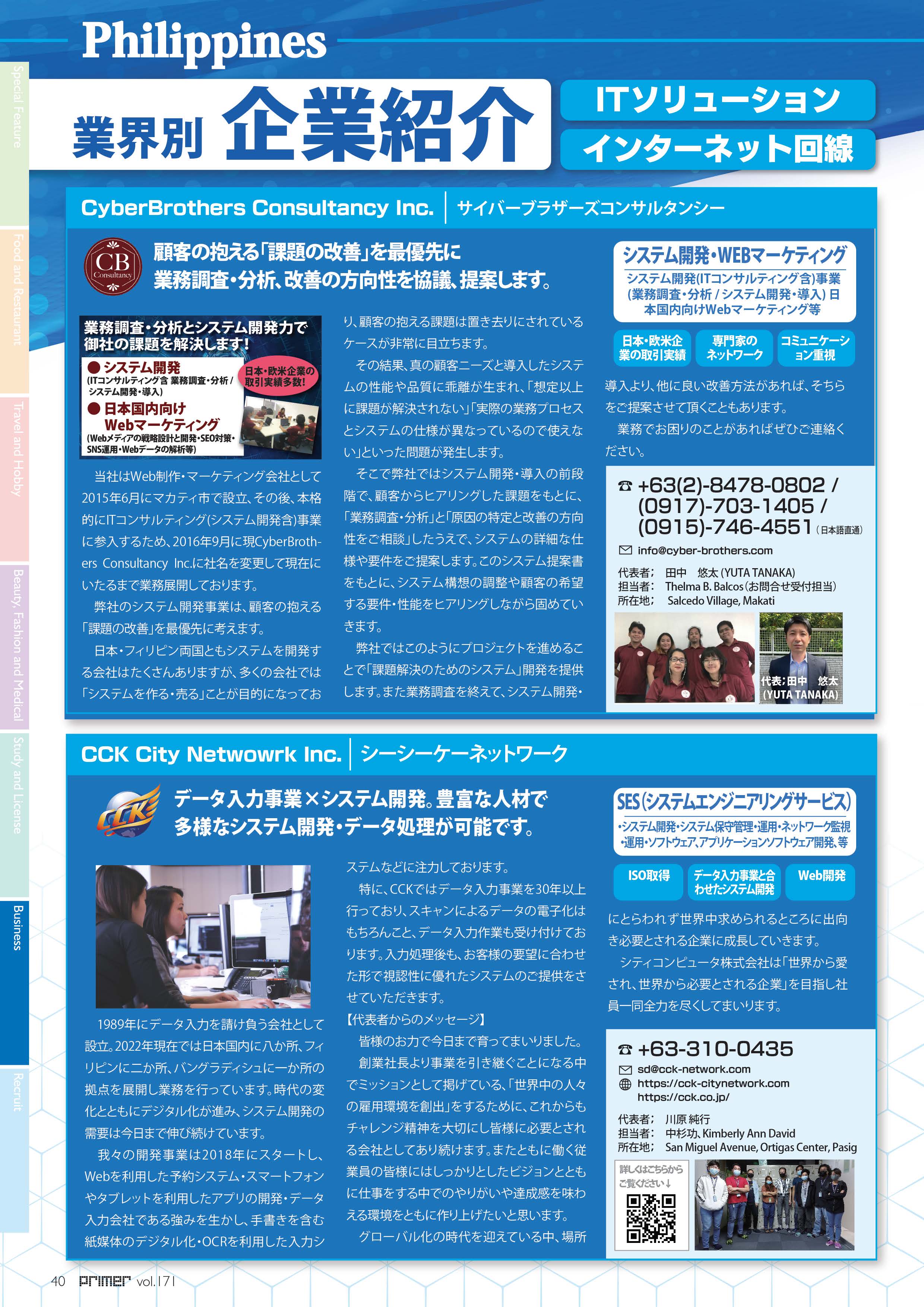 - ビジネス特集は、装いもあらたに【業界別企業紹介】として再スタート!本号ではITソリューション・インターネット回線とその周辺業界の注目情報を集めました。 またJETROのフィリピンビジネスコラムも必見です!