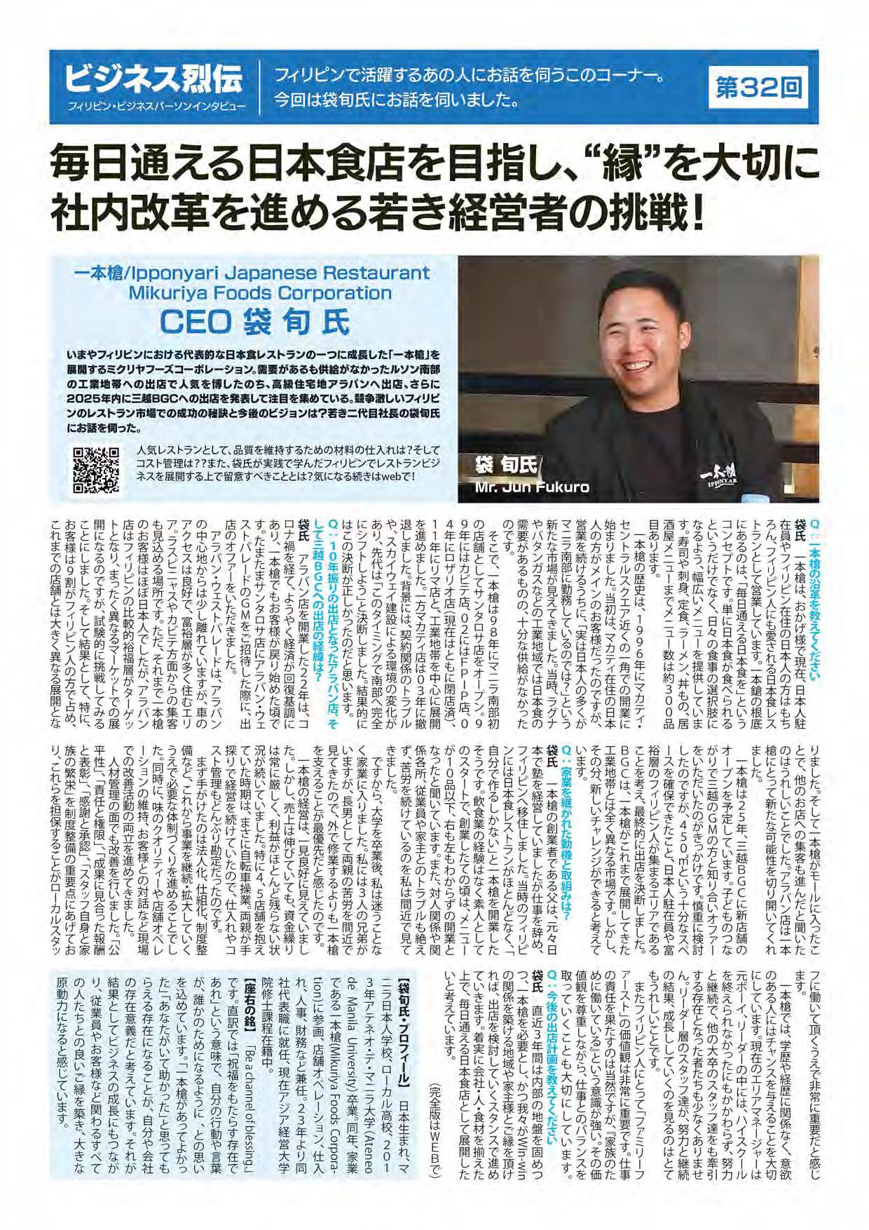 いまやフィリピンにおける代表的な日本食レストランの一つに成長した「一本槍」を展開するミクリヤフーズコーポレーション。需要があるも供給がなかったルソン南部の工業地帯への出店で人気を博したのち、高級住宅地アラバンへ出店、さらに2025年内に三越BGCへの出店を発表して注目を集めている。競争激しいフィリピンのレストラン市場での成功の秘訣と今後のビジョンは?若き二代目社長の袋旬氏にお話を伺った。