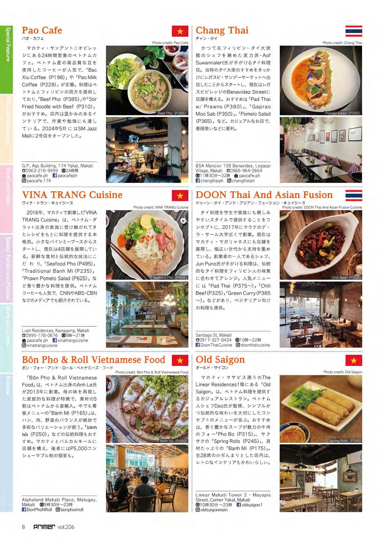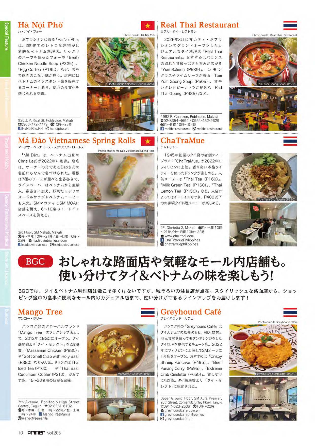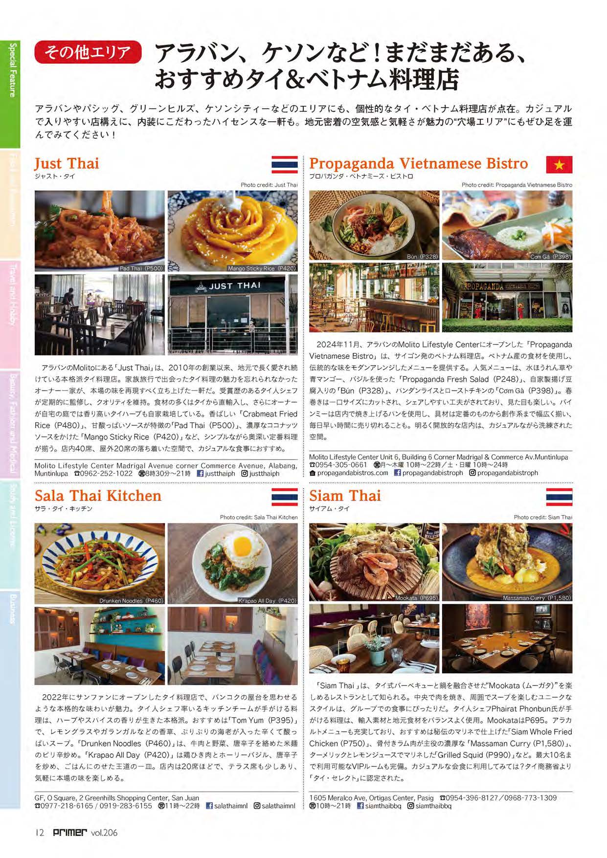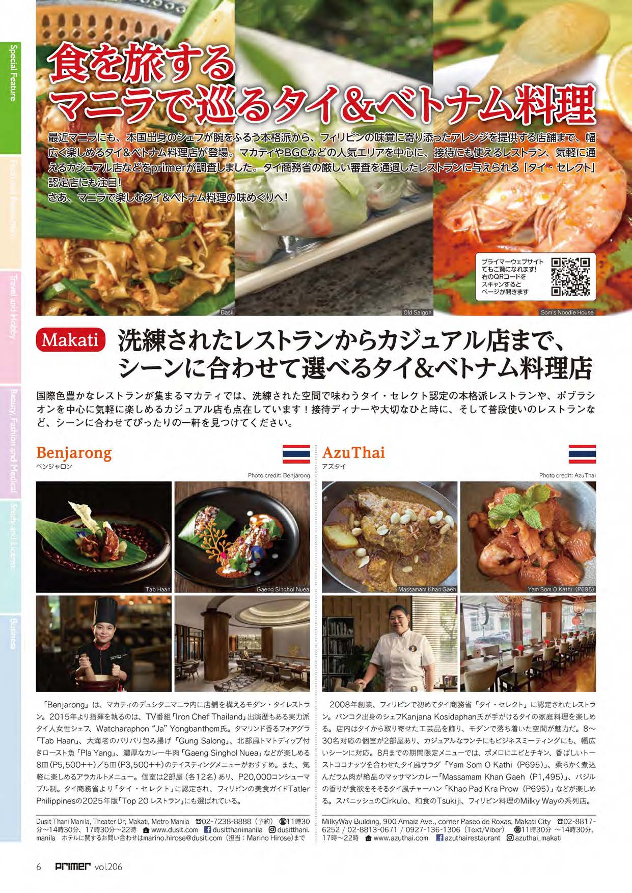 - 最近マニラにも、本国出身のシェフが腕をふるう本格派から、フィリピンの味覚に寄り添ったアレンジを提供する店舗まで、幅広く楽しめるタイ&ベトナム料理店が登場。マカティやBGCなどの人気エリアを中心に、接待にも使えるレストラン、気軽に通えるカジュアル店などをprimerが調査しました。タイ商務省の厳しい審査を通過したレストランに与えられる「タイ·セレクト」認定店にも注目! さあ、マニラで楽しむタイ&ベトナム料理の味めぐりへ!