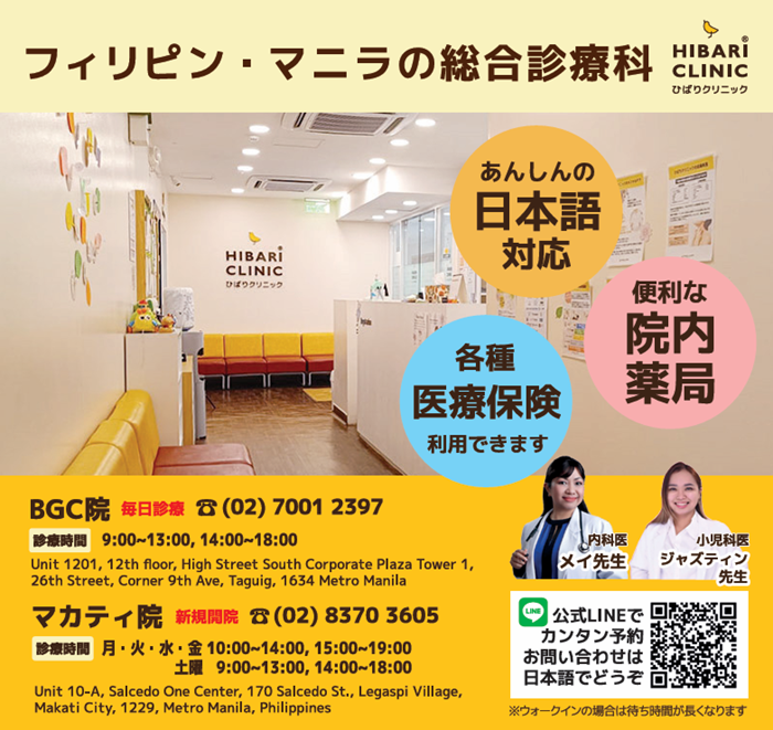 ひばりクリニックは、2021年5月にBGCマニラに開院、2025年11月にマカティに開院した、地域密着型の医療クリニックです。BGC院は土日祝日も毎日診療、マカティ院は土曜日もオープン(木日祝休診)。まるで日本にいるような医療クリニックの環境づくりを心がけています。日本語対応スタッフがお問い合わせから来院後のケアまで一貫して日本語で対応いたします。院内薬局でのお薬処方、日本やフィリピンの医療保険による医療費キャッシュレスサービスなど、便利にご利用ください。