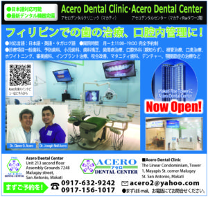 【マカティ】岡山大学大学院医歯薬系研究科補綴学専攻科で博士号を取得したDr. Claver O. Acero Jrが同じく歯科医師で歯科矯正を専門とするご子息の Dr. Joseph Neil Aceroとともに歯科医療に携わる歯科医院
