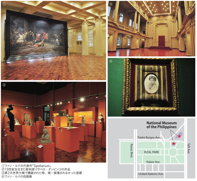 リザール公園の隣にある1901年創立の博物館。2つの建物があり、1つはNational Art Galleryと呼ばれ、ファン・ルナやフェリックス・レスレクシオン・ヒダルゴといったフィリピンを代表する芸術家の作品を数多く取り扱う。1階の入口の正面にある展示室には、1884年に完成したルナの代表作「Spoliarium」を展示している。高さ4.22メートル、横幅7.675メートルで、フィリピン最大の油絵だ。また同室にはヒダルゴの代表作「ブスタマンテ総督の暗殺」も展示。その他の展示室には、ルナやヒダルゴの他の作品や、1800年代後半から1970年代までの数多くの芸術家の絵画や彫刻が展示されている。もう1つの建物Museum of the FilipinoPeopleでは、1600年代に沈没したスペインのサン・ディエゴ号から回収された大砲や壺など、多くの遺留品を展示。 10月の間は開館記念で入場料が無料になるプロモを実施予定。