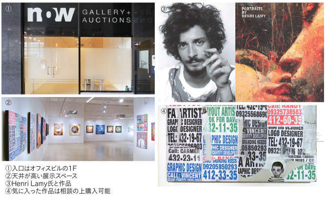 2011年オープン。絵画、彫刻、写真、デジタルアートなど様々な種類のコンテンポラリーアートの作品を展示している。2週間〜1ヶ月に1回ほどのペースで展示を入れ替え。9/30〜10/31は、フランス人アーティスト、HenriLamy氏の作品展を開催予定。Lamy氏は国際的に活躍中の作家で、これまでニューヨーク、東京、北京、シンガポールといった都市で展覧会を行ってきた。今回はフィリピンを2ヶ月かけて巡った中で出会った人々の表情を躍動的に捉えたポートレイトを展示。ギャラリー内で作家が自分の作品を制作する「ライブ・ペインティング」など、独自の企画イベントにも積極的。展示品のうち気に入った作品は相談の上購入可能で、美術品のオークションも随時開催している。