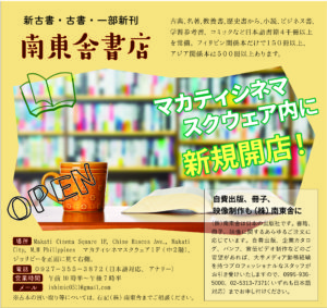 【南東舎書店は閉店しました】古典、名著。教養書、歴史書から、小説、ビジネス書、学習参考書、コミックなど日本語書籍4千冊以上を常備。フィリピン関係本だけで150冊以上、アジア関係本は500冊以上あります。