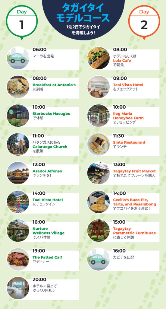 マニラから車でおよそ3時間。高原の澄んだ空気と美しい景観に包まれる、週末の定番リゾート・タガイタイ。タール火山を望む壮麗なパノラマ、名物料理ブラロの滋味深い味わい、洗練されたカフェとラグジュアリーホテルの数々。日常を離れ、心を解き放つための理想的な場所です。そんなタガイタイを1泊2日で満喫するモデルコースをご紹介。