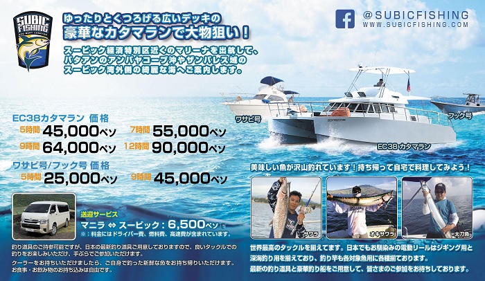 ゆっくりとくつろげる広いデッキの豪華なカタマランで大物狙い! スービック経済特別区近くのマリーナを出航して、バタアンのアンバヤコーブ沖やザンバレス域のスービック湾外側の綺麗な海へご案内します。